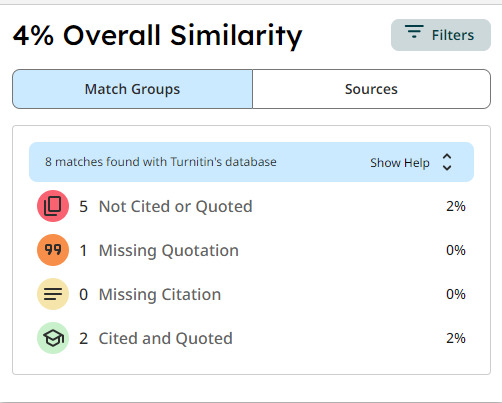 Reality – A high score simply indicates that parts of the submission are similar to other sources. Properly cited quotes and common phrases may result in higher scores, but these are not necessarily plagiarism. Instructors analyze each similarity report to distinguish between correctly cited work and actual plagiarism.